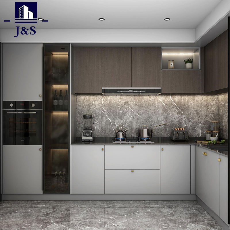 Chúng tôi cung cấp Tủ bếp gia đình bằng gỗ công nghiệp chưa lắp ráp. Đây là một tam giác làm việc trong nhà bếp hình chữ U. Người sử dụng bếp không chỉ có khu vực làm việc rộng rãi trong việc chuẩn bị thức ăn, dọn dẹp bát đĩa mà còn có thể dễ dàng tương tác với những người bên ngoài bếp. Màu tối là cổ điển, vĩnh cửu, cao cấp và có thể sử dụng lâu dài. Nó tạo ra một không gian làm việc rộng rãi cho một người nấu ăn. Chất liệu laminate có hiệu suất tuyệt vời trong khả năng chống trầy xước và cách nhiệt.